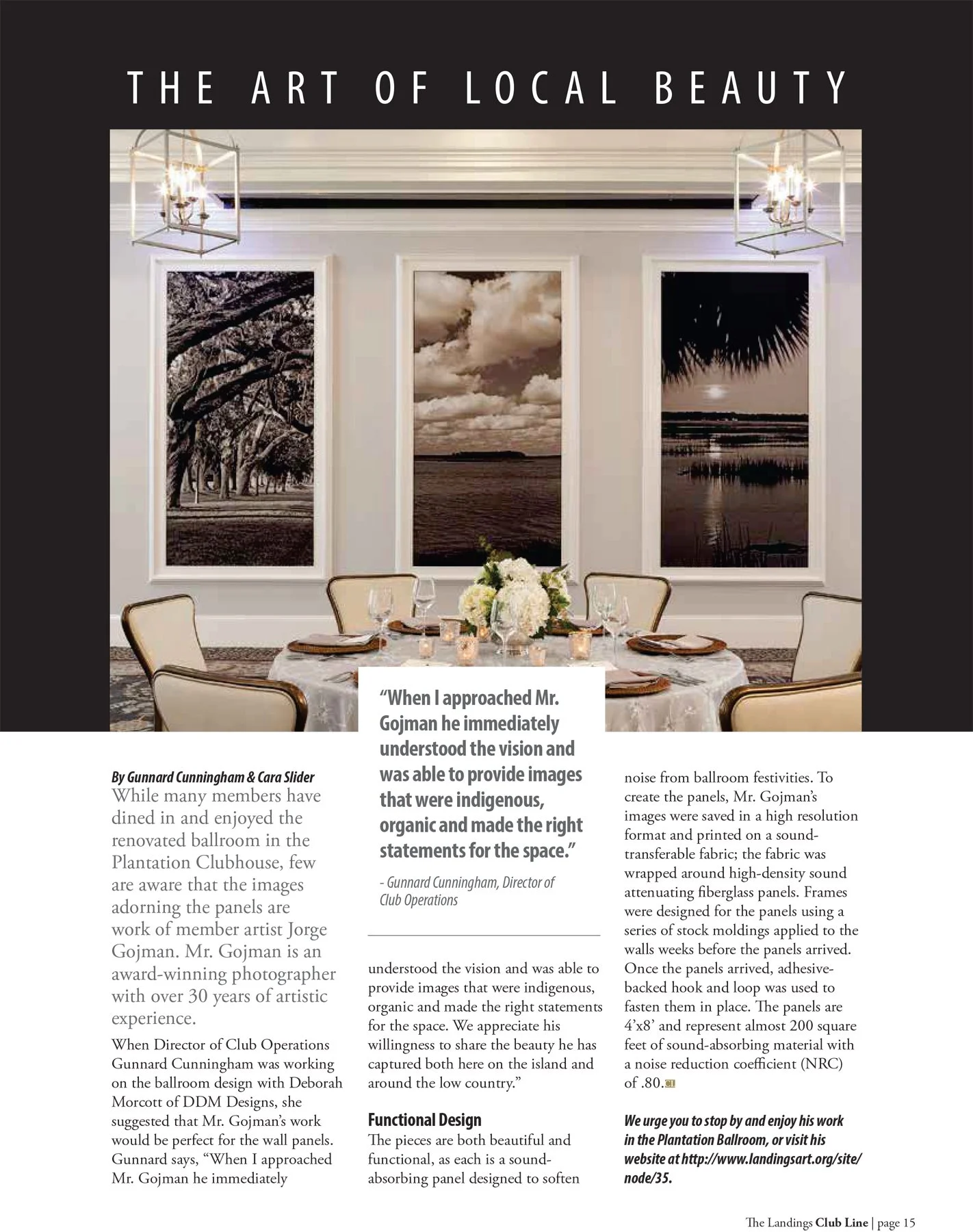 Participating sporadically in LAA exhibits since 1998 including as "Artist of the Month", my images have been awarded several 1st Place Blue Ribbons in Photography, "Best of Show" and “People's Choice” at the annual juried Spring Art Shows. I have exhibited my work at the various LAA venues as well as in commercial galleries and have been published in a number of magazine issues. The Landings residents and visitors have been enjoying my 6 Photo Murals adorning the walls of the Palmetto Clubhouse Ballroom at The Landings Club since it was remodeled in 2014.